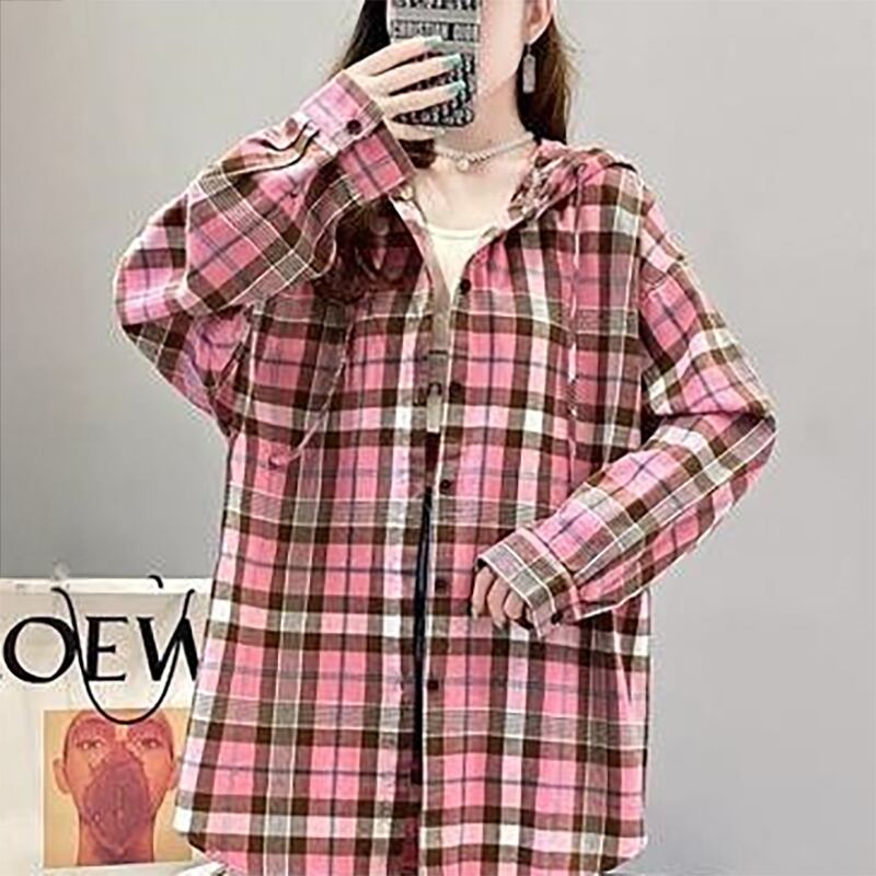 とってもキュートなフード付き格子長袖シャツコート。明るいチェックの柄が気分を上げます。